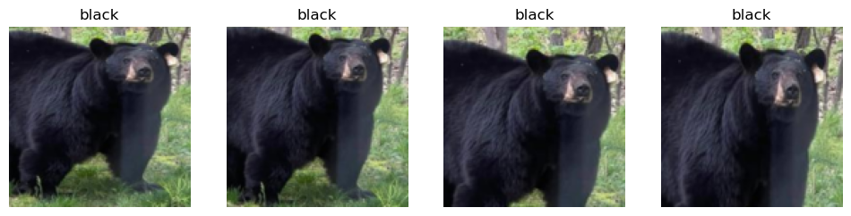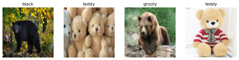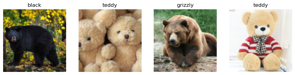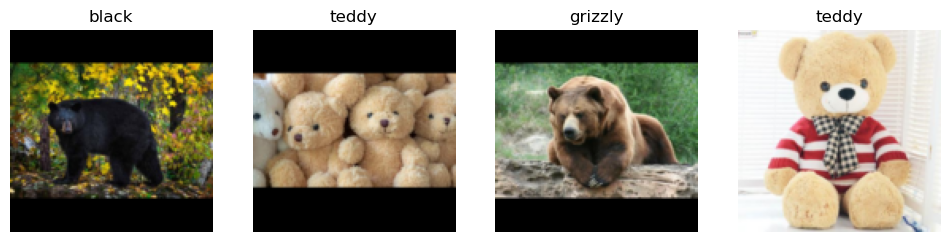 We don’t have a lot of data for our problem (150 pictures of each sort of bear at most), so to train our model, we’ll use RandomResizedCrop with an image size of 224 px, which is fairly standard for image classification, and default aug_transforms: