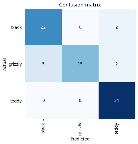 The rows represent all the black, grizzly, and teddy bears in our dataset, respectively. The columns represent the images which the model predicted as black, grizzly, and teddy bears, respectively. Therefore, the diagonal of the matrix shows the images which were classified correctly, and the off-diagonal cells represent those which were classified incorrectly. This is one of the many ways that fastai allows you to view the results of your model. It is (of course!) calculated using the validation set. With the color-coding, the goal is to have white everywhere except the diagonal, where we want dark blue. Our bear classifier isn’t making many mistakes!