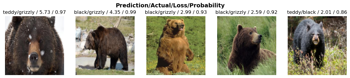 It’s helpful to see where exactly our errors are occurring, to see whether they’re due to a dataset problem (e.g., images that aren’t bears at all, or are labeled incorrectly, etc.), or a model problem (perhaps it isn’t handling images taken with unusual lighting, or from a different angle, etc.). To do this, we can sort our images by their loss.