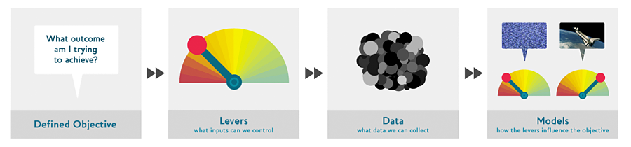 The Drivetrain Approach was described in detail in “Designing Great Data Products”. The basic idea is to start with considering your objective, then think about what actions you can take to meet that objective and what data you have (or can acquire) that can help, and then build a model that you can use to determine the best actions to take to get the best results in terms of your objective.
